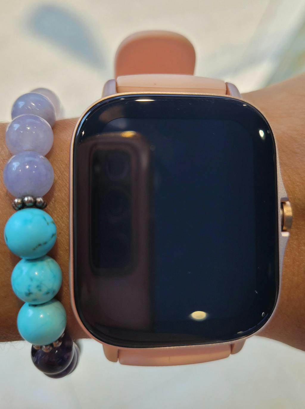 The Amazfit GTS 2 New Version has the same look as the original but there are some design changes. According to Zepp, while the standard version has 3D glass and a glossy plastic bottom shell, the new version swaps it for 2.5D glass and a matte plastic bottom shell, respectively. It also lacks the diamond-like carbon coating (DLC) of the 2020 version which adds protection against scratches and wear. Furthermore, the New Version is not only slightly wider and thicker by a few millimetres, but it's also a few grams heavier. Zepp has released the new version in two new colours—Space Black and Petal Pink— with a dotted strap, different from the smooth strap of the standard version.