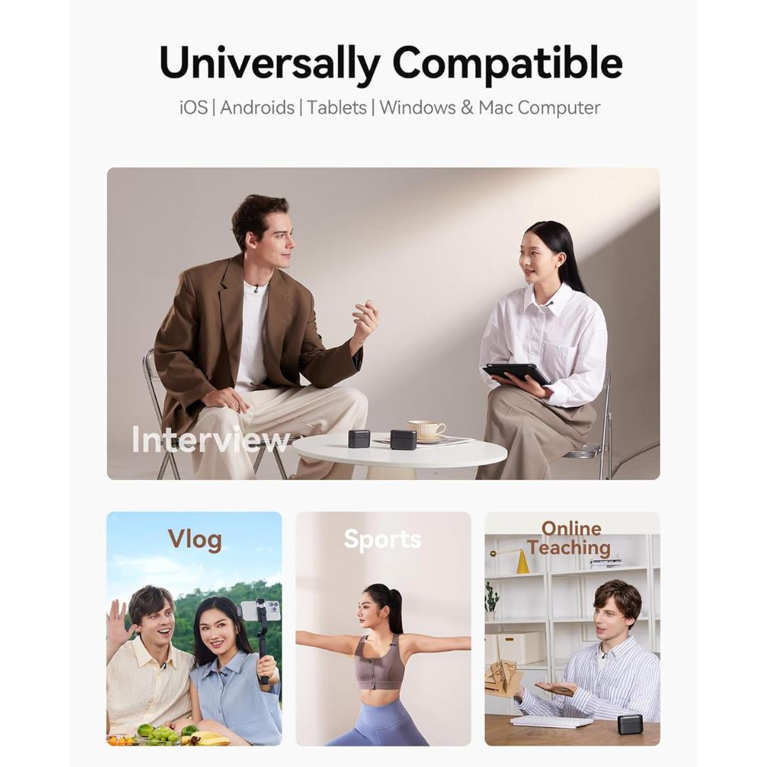 Each transmitter offers up to 10 hours of continuous usage, ensuring you never run out of power during long shoots, events, classes, or productions. The included charging case provides up to 40 hours of total backup, making it the ideal microphone kit for creators on the move
